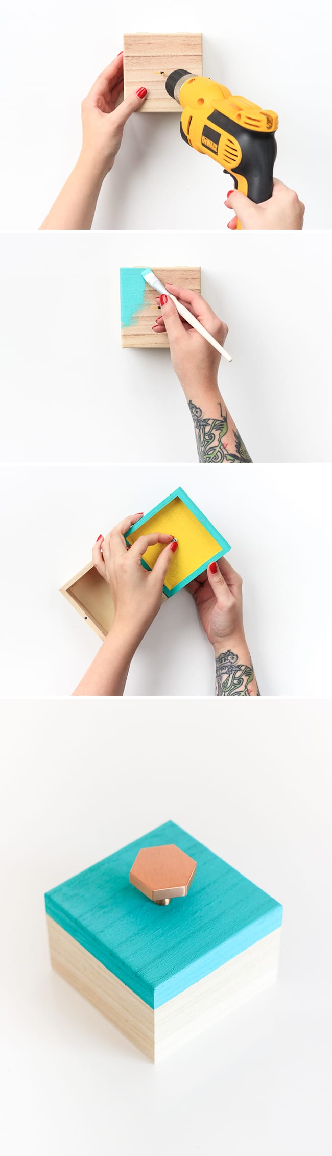 Find the center of your box and drill a hole. Paint however you like. I decided to just paint the lid one color, while adding another pop of hidden color on the inside. Once your paint is dry, screw your hardware into place and you’re done!